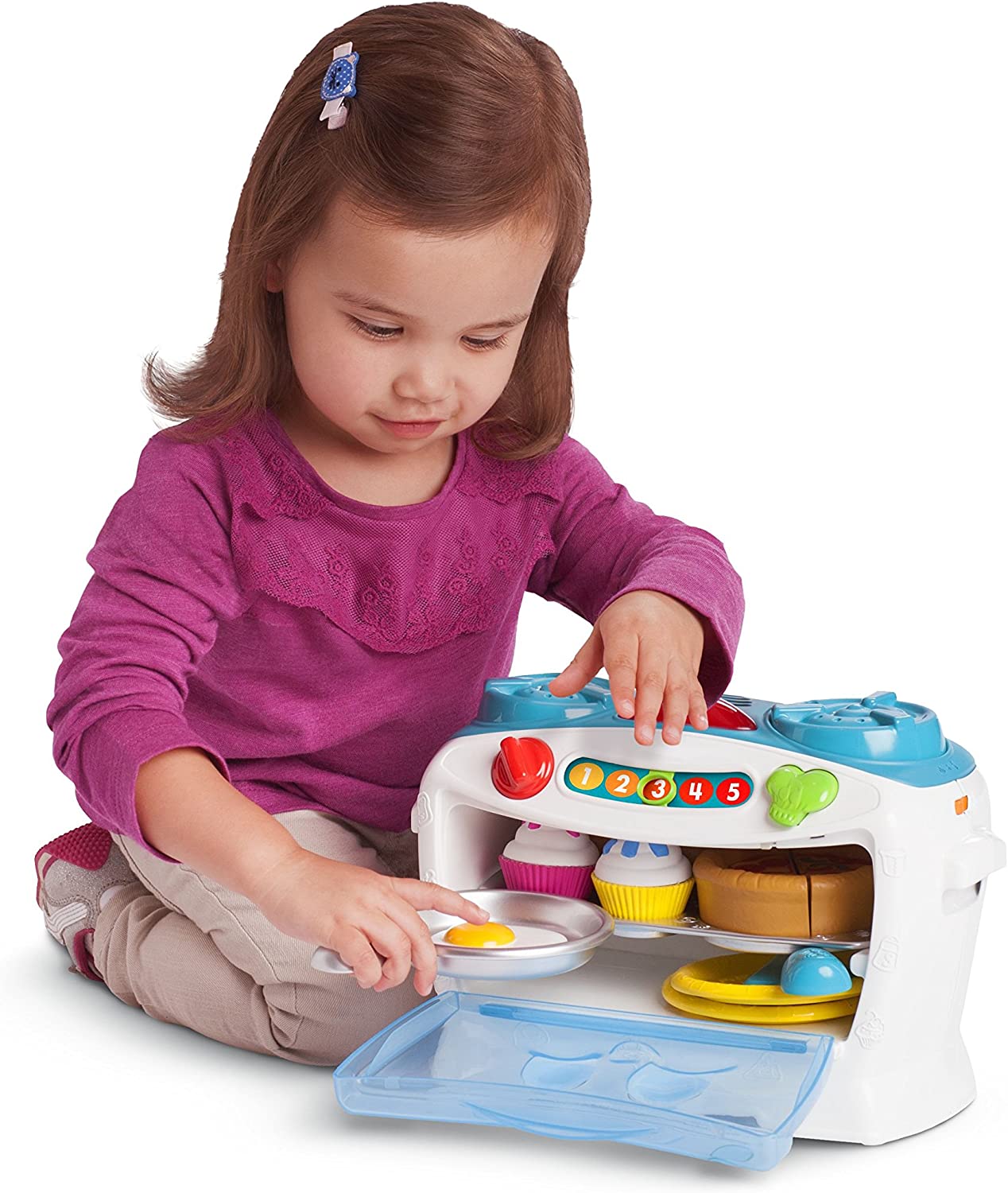 - Move the number slider to explore numbers, time and temperature. Place the pan on the stove for real sizzle sounds. Turn the timer and count clicks! Close the oven to explore numbers and counting. Open it to learn about counting and sharing